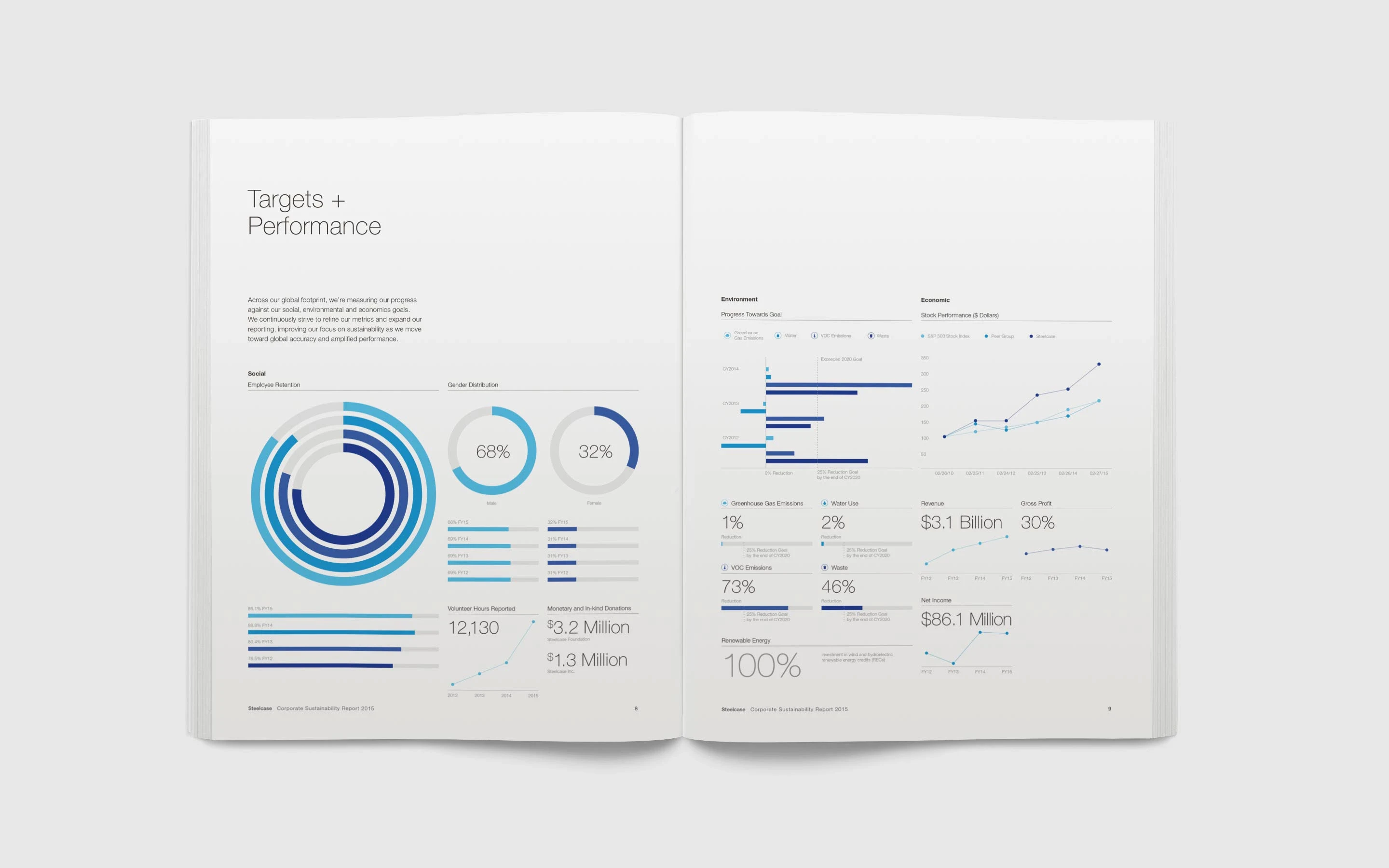 Créations de rapports RSE pour Steelcase International. Pour chaque édition, le design est repensé : des visuels minimalistes (infographies claires, icônes élégantes) et une typographie sobre (lisibilité maximale) pour mettre en valeur les données et leurs impacts. Versions multilingues.